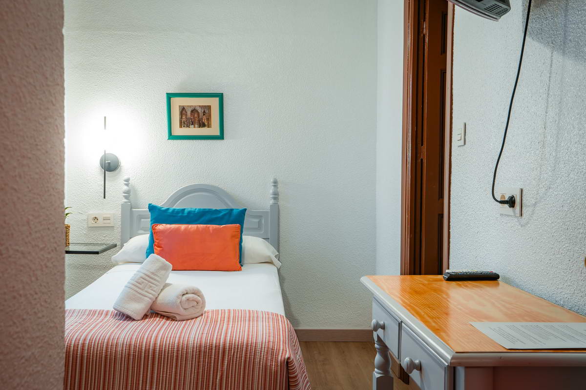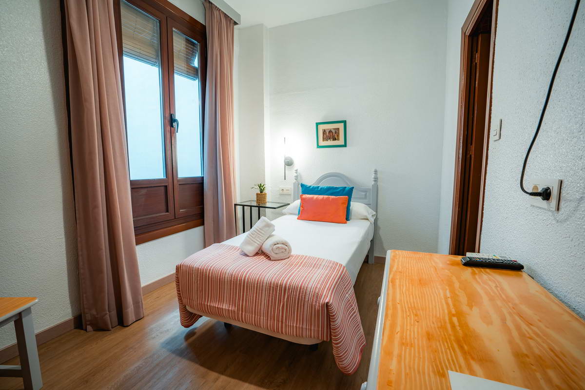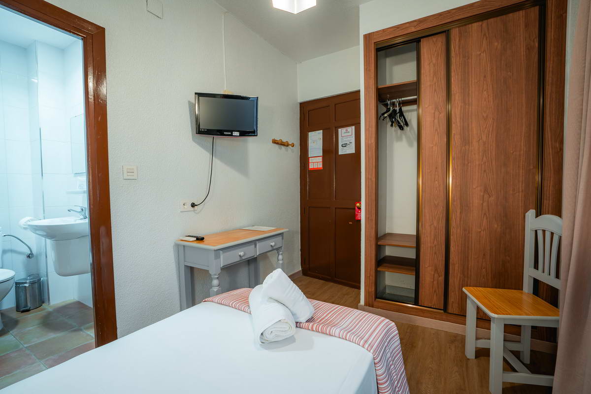 Habitación individual climatizada con baño completo, agua caliente, TV secador de pelo y balcón privado.