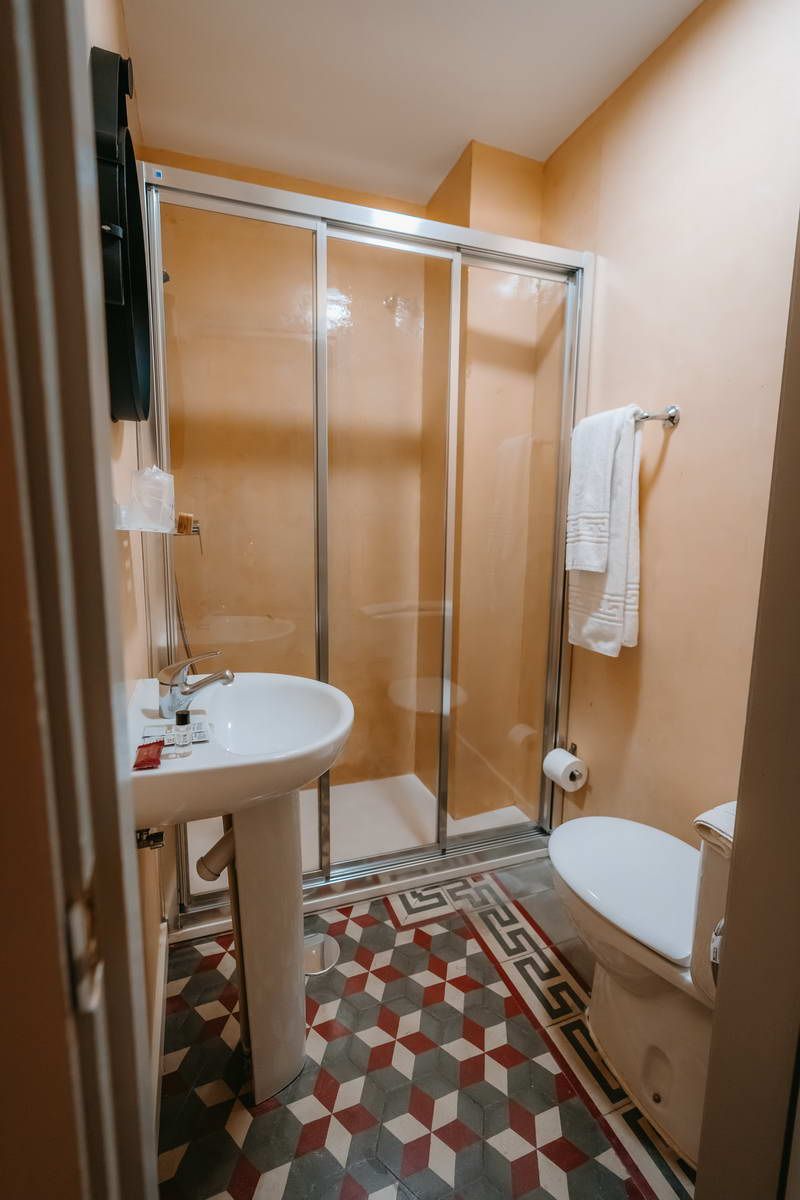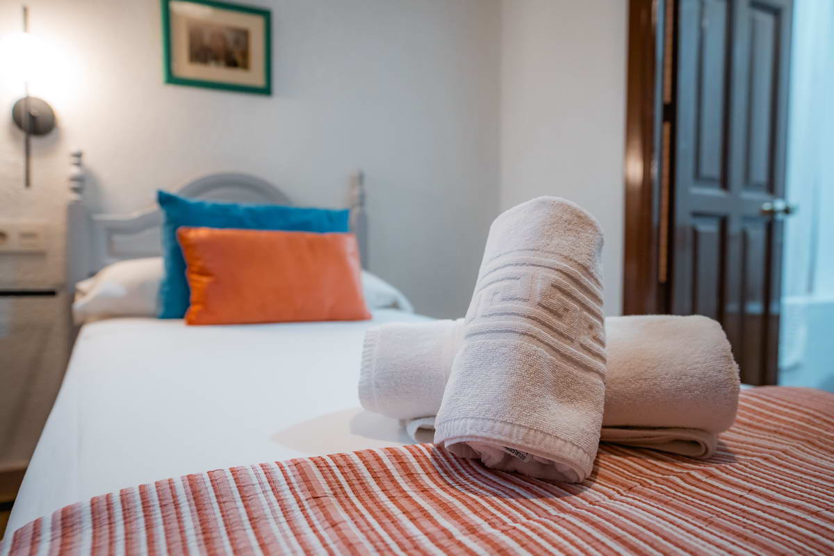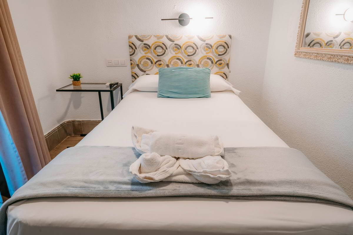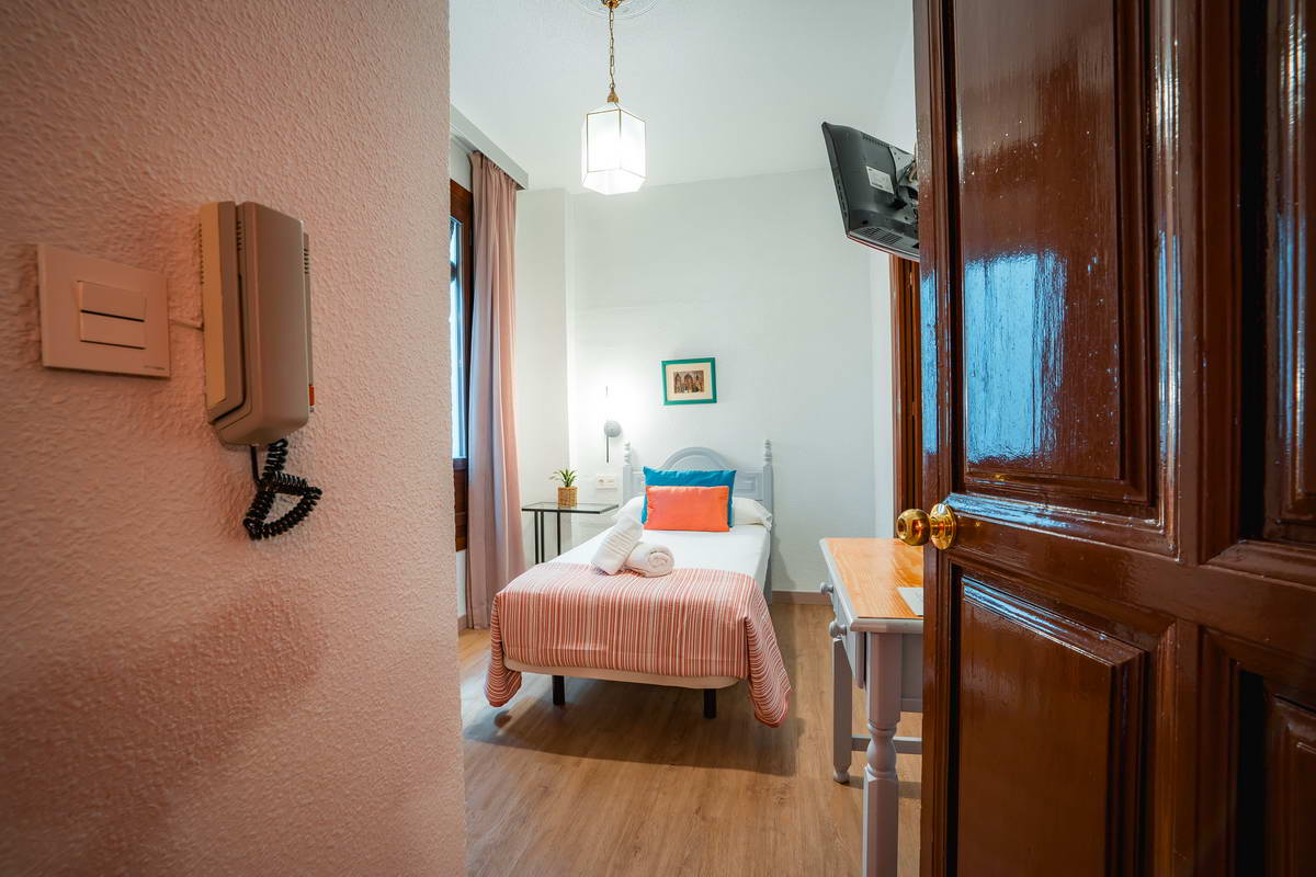 Habitación individual climatizada con baño completo, agua caliente, TV secador de pelo y balcón privado.
